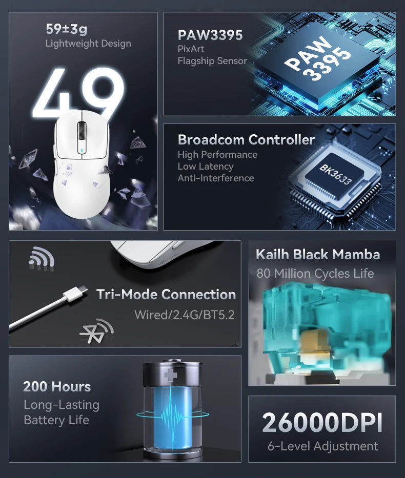 Sensor model: Pixart 3395 (26000 DPI|650 IPS|50G)