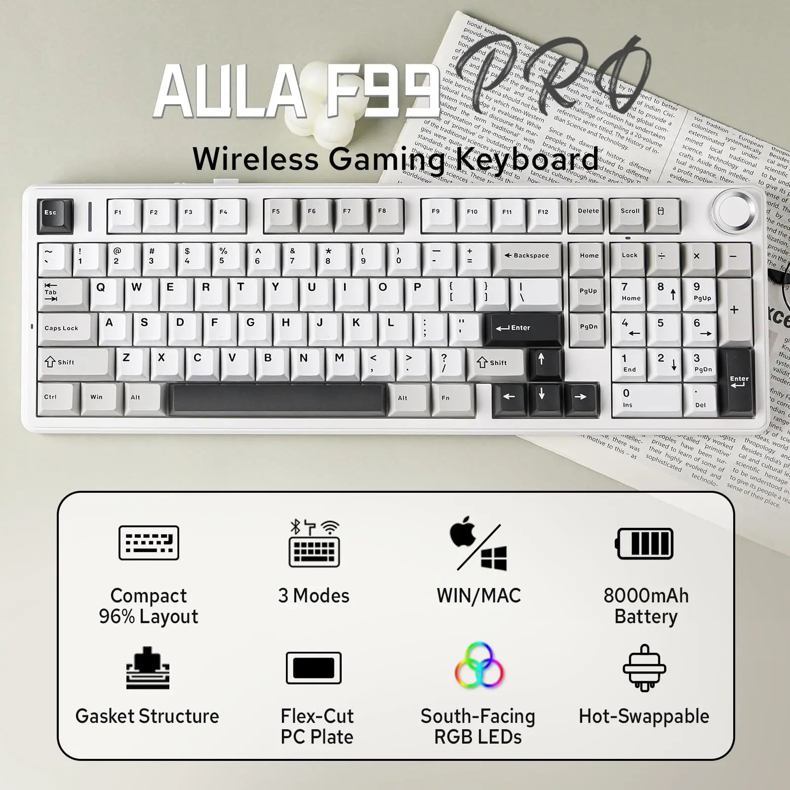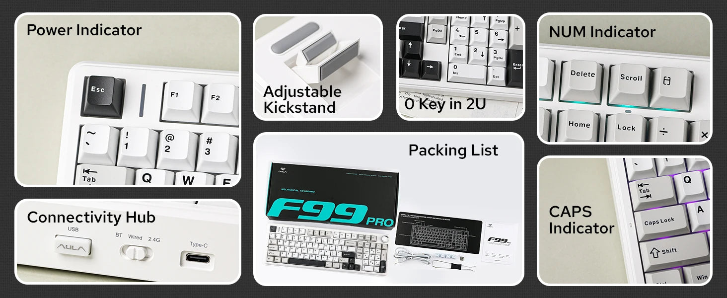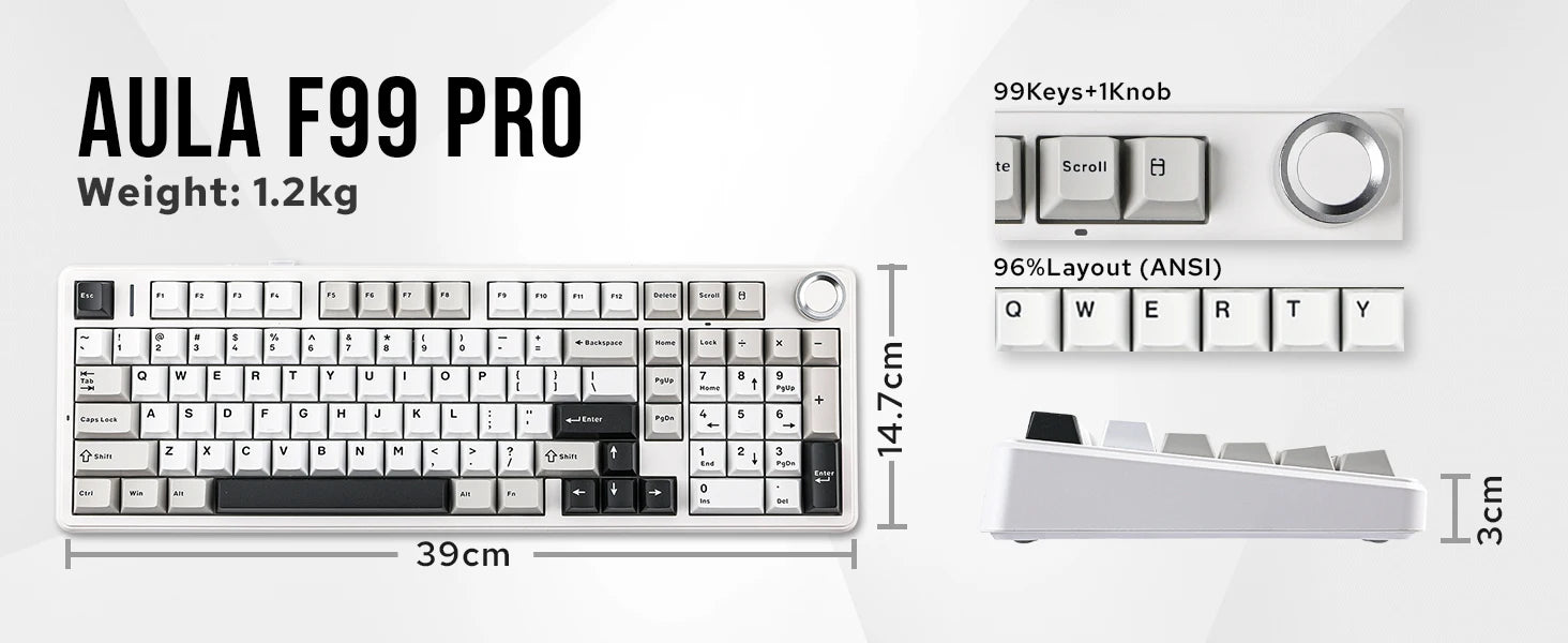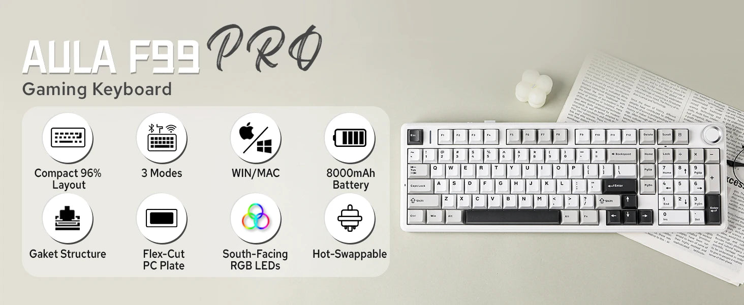 Aula F99 PRO 96% Mechanical Gaming Keyboard BT5.0/USB-C/2.4G Wireless Hot Swappable Gasket Custom Keyboard With 8000mAH Battery