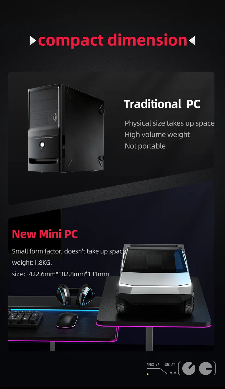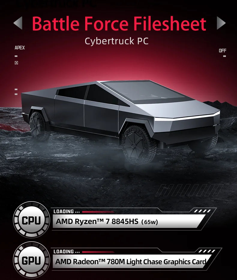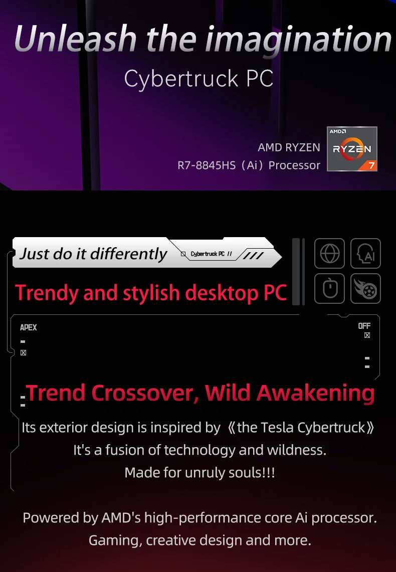 Cybertruck Gaming Mini PC AMD RYZEN5 7640HS/RYZEN7 8845HS Support WIN10 LINUX with 2xDDR5 HDMI Full-funtion TYPE-C Computer