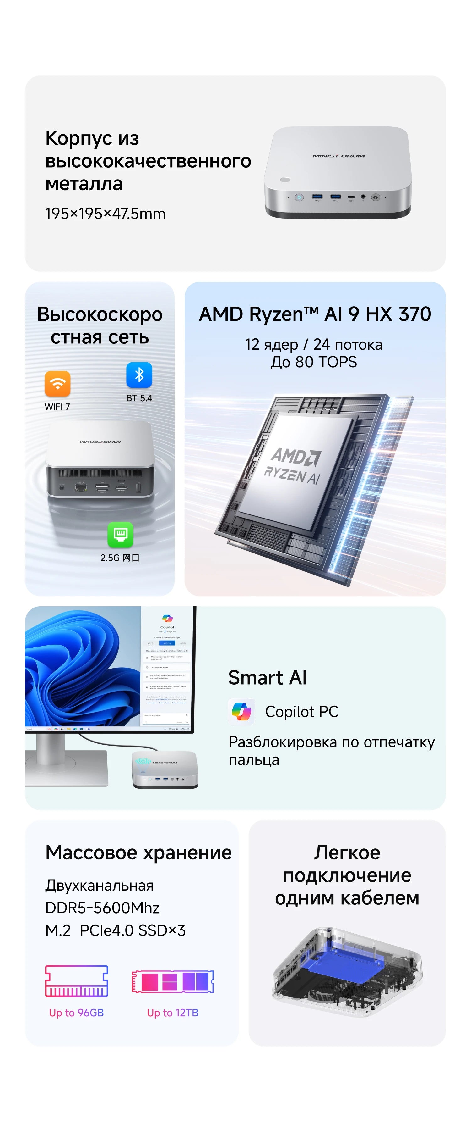 MINISFORUM AI X1 Pro Mini PC AMD Ryzen AI 9 HX 370 DDR5 96GB 2TB WiFi 7 Copilot AI 135W Adapter Dual 2.5G LAN Office PC Gaming