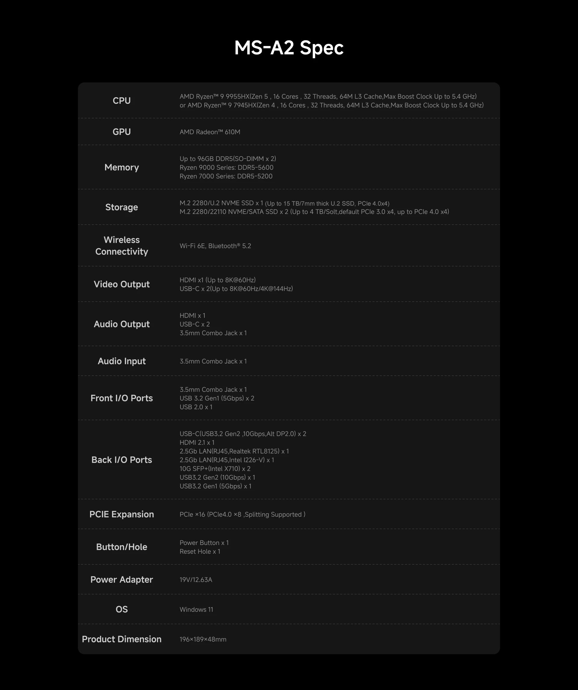MINISFORUM MS-A2 MINI PC AMD Ryzen 9 9955HX PC Windows 11 Pro Support 96GB DDR5 64GB 1TB SSD U.2 NVME Support 10G SFP+ PC Gaming