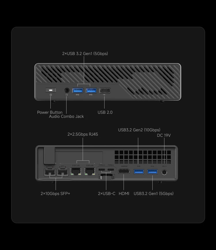 Audio Input: Type-C(USB3.2 Gen2 10Gbps)(Alt DP2.0) x2;HDMI2.1 x1;2.5 LAN(RJ45)(Intel RTL8125) x1;2.5 LAN(RJ45)(Intel I226-V) x1;10G SFP+(Intel X710) x2;USB Type A(USB3.2 Gen2) x1;USB Type A(USB3.2 Gen1) x1
