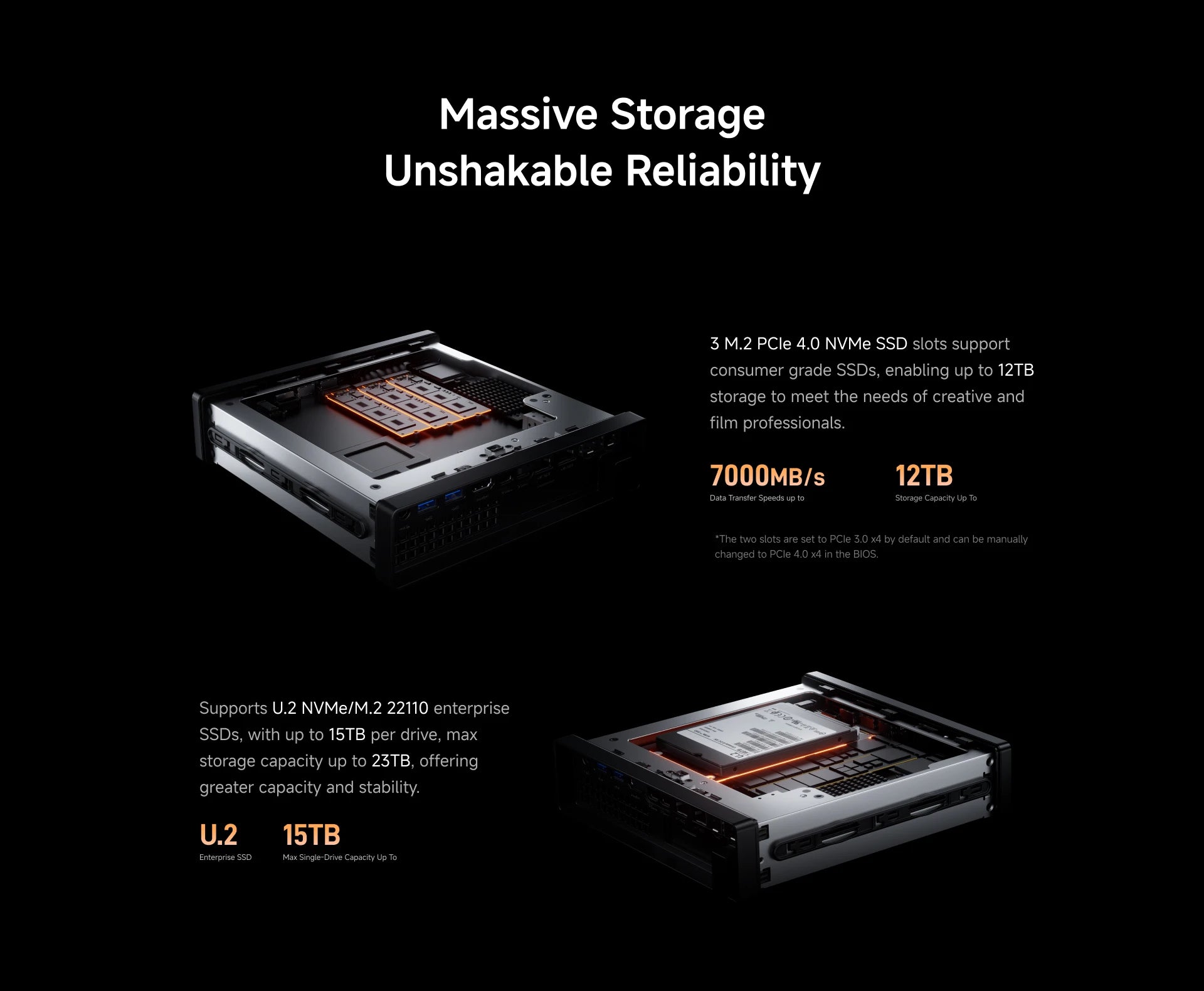 Storage: M.2 2280/U.2NVME SSD *1 (Up to 15TB/7mm thick U.2 SSD)(PCIe 4.0 x4)(OnBoard);M.2 2280/22110NVME/SATA SSD *2(Up to 4TB)(PCIe 4.0x4)(OnBoard)